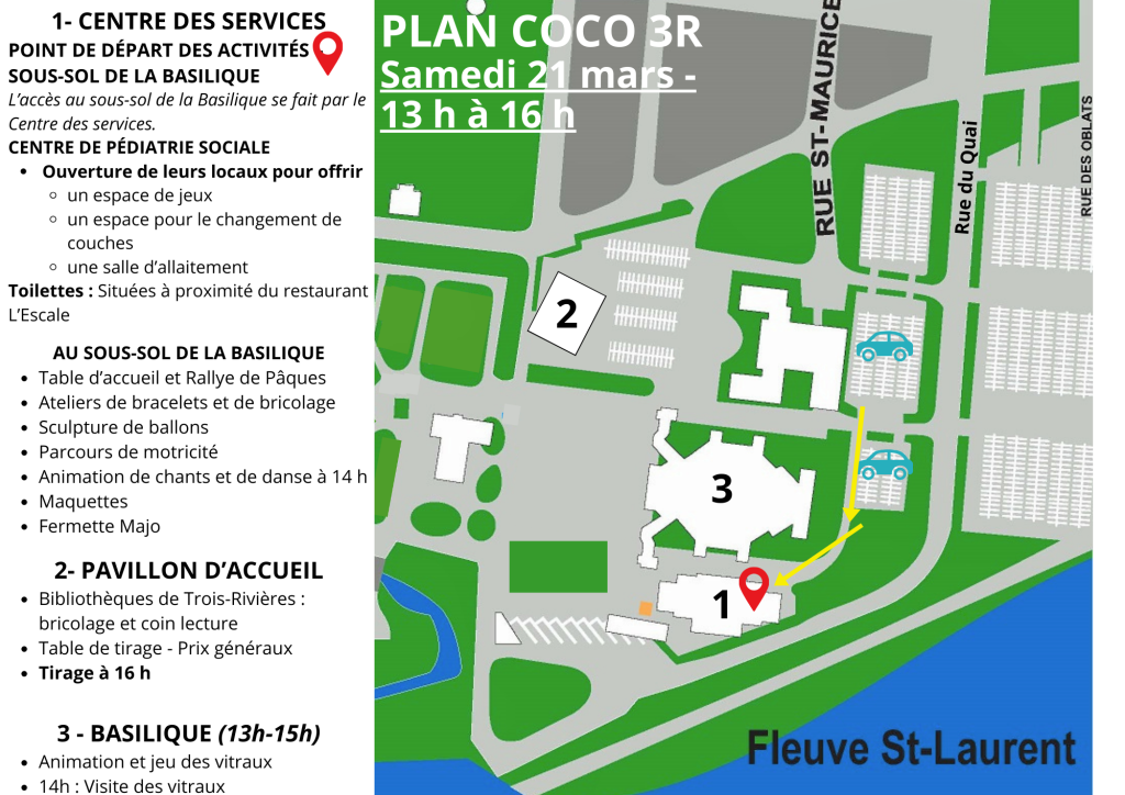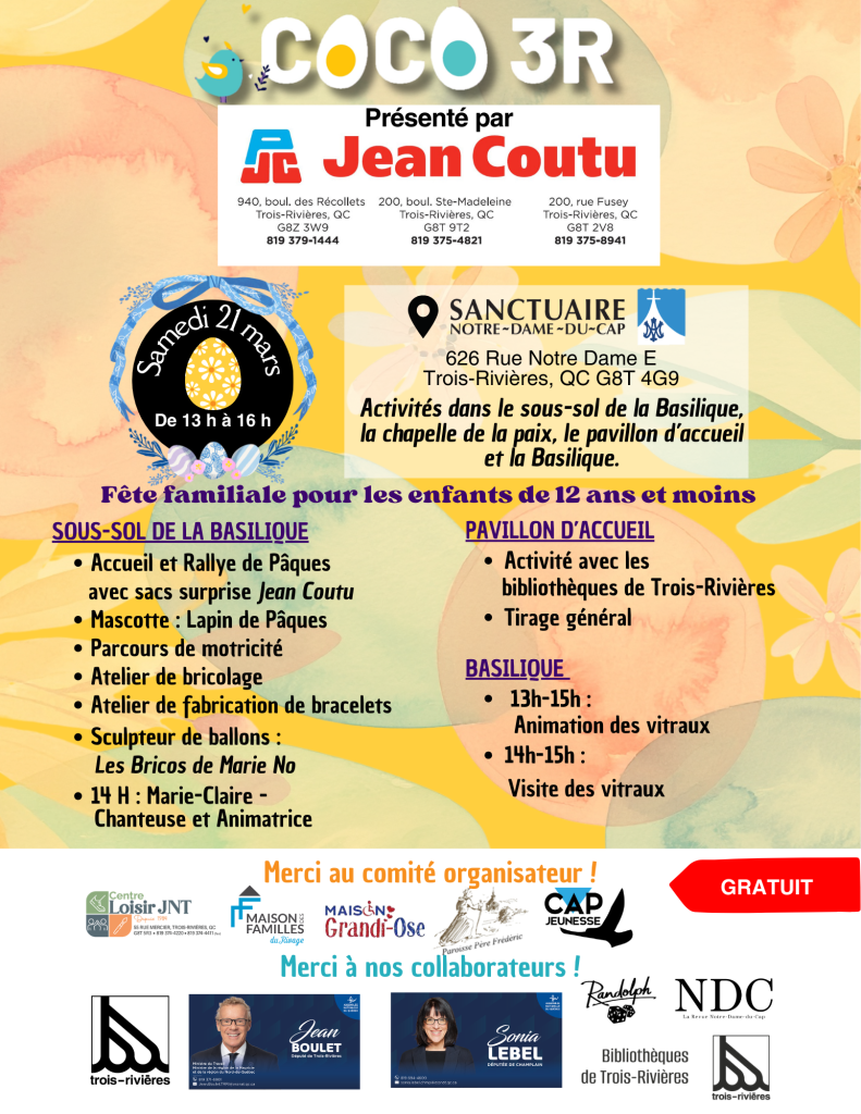 Présenté par les pharmacies Jean Coutu des succursales Récollets, Ste-Madeleine et Fusey nous sommes prêts à accueillir 350 enfants avec leurs familles dans le sous-sol de la Basilique, dans la Basilique entre 13h et 15h et au pavillon d’accueil pour notre 10e édition COCO 3R.