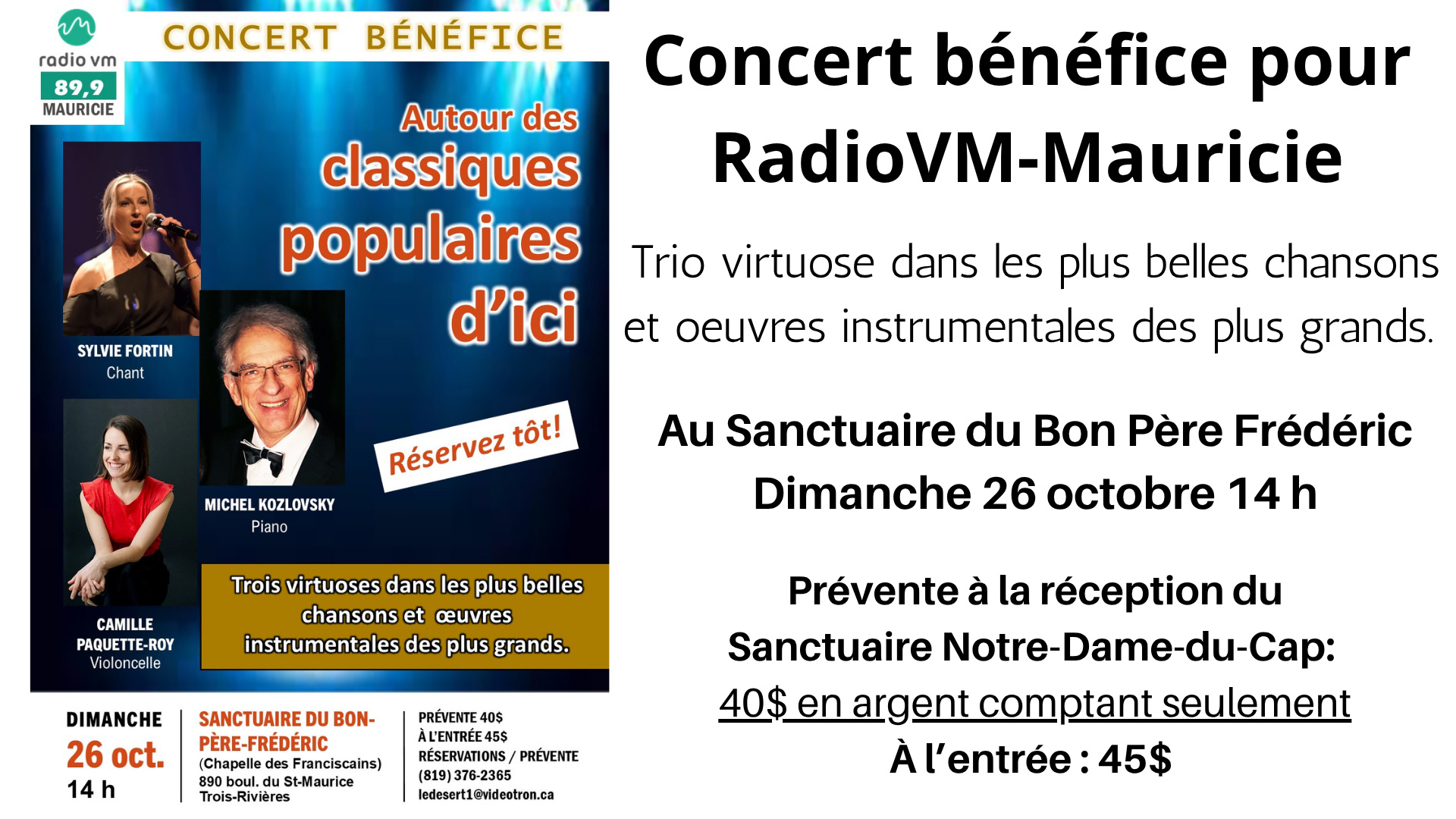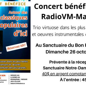 Nous vous rappelons que le concert bénéfice de RadioVM-Mauricie approche à grands pas ! Il aura lieu au Sanctuaire du Bon Père Frédéric, dimanche 26 octobre à 14 h.