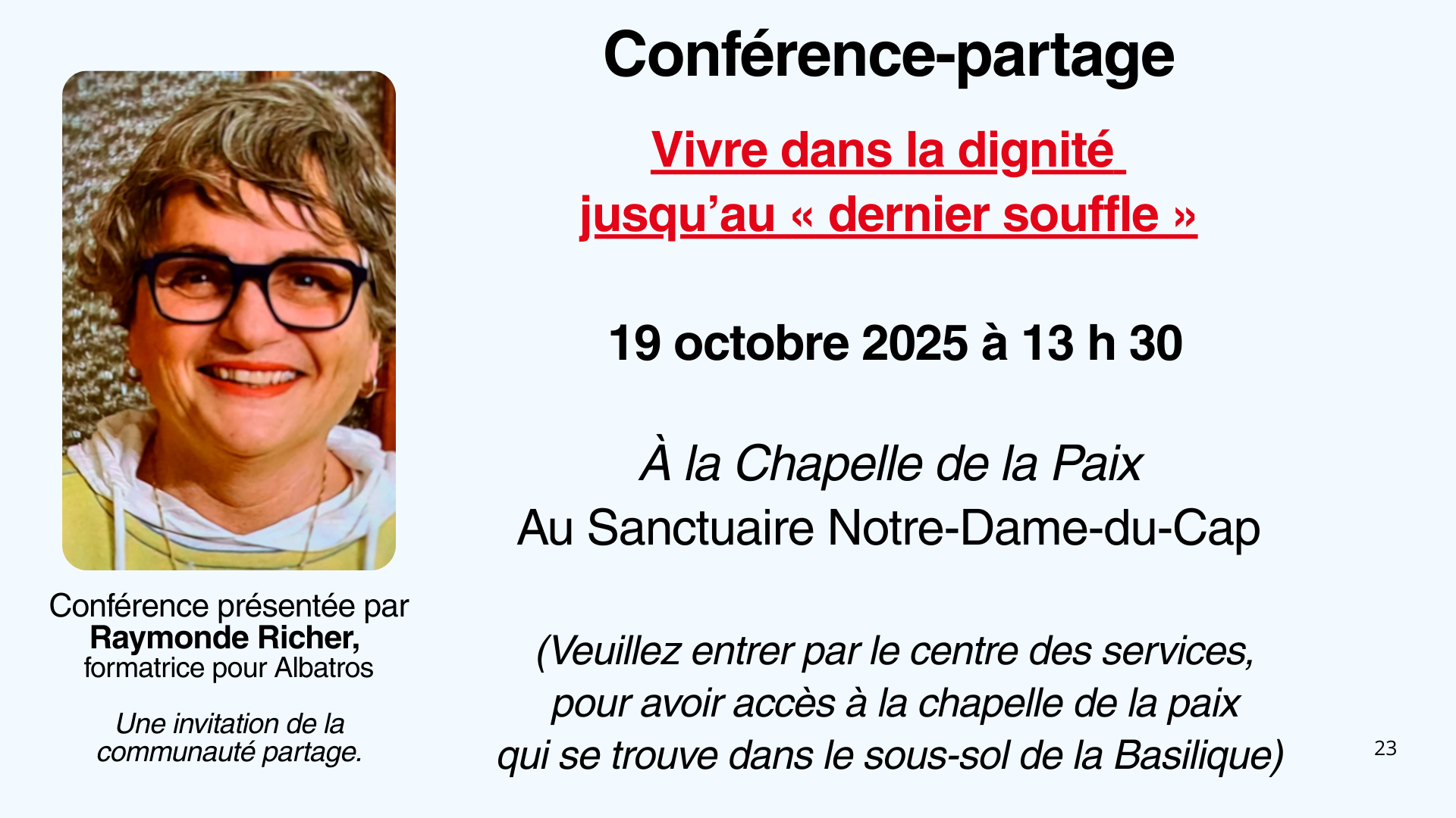 La conférencière, Raymonde Richer, se propose d’aborder les sujets suivants: accompagnement personnalisé en fin de vie, l’aide médicale à mourir, proposer des exemples d’accompagnement en fin de vie… Elle est intervenante en soins spirituels CIUSSS. Elle a co-écrit avec le dr Patrick Vinet, Conversation à marée basse, écouter les personnes en soins palliatifs