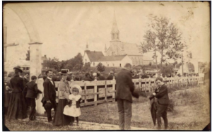 Circa 1900-1903, the Old Shrine and its 1891 annex. In the background, the 1880 parish church.