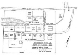 This map shows the location of Fort Saint-François. The small church shown on this map is today’s Old Shrine. The other church, the parish church, no longer exists.
