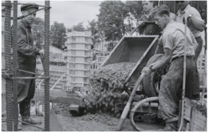 Workers, including Mr. Bourbeau on the left, pour the foundations for the future basilica.